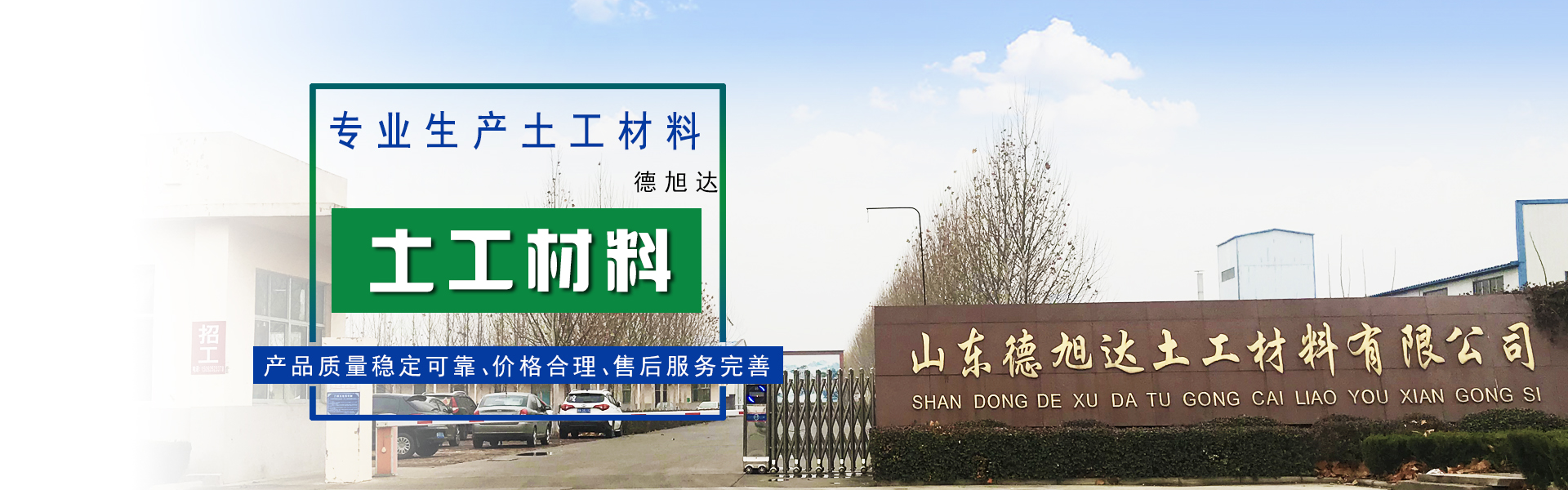 山東德旭達(dá)土工材料有限公司是目前規(guī)模較大,品種較全的土工合成材料專業(yè)生產(chǎn)企業(yè),是全國土工合成材料生產(chǎn)基地重點(diǎn)企業(yè)之一,注冊資本為5070萬元,占地面積120畝,現(xiàn)有員工100余人,其中各類專業(yè)技術(shù)人員40多人。 地理位置優(yōu)越,交通十分便捷。山東德旭達(dá)土工材料有限公司位于西漢大文學(xué)家東方朔故里,魯西北著名歷史名城—德州 市陵城經(jīng)濟(jì)開發(fā)區(qū)。京滬高速鐵路依縣而過,京福高速公路、德煙鐵路、京滬鐵...【了解更多】